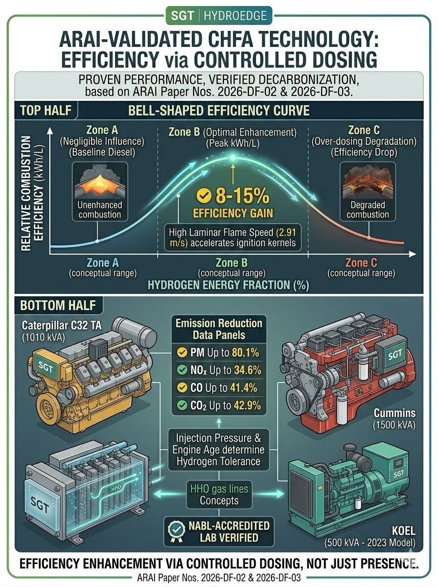 Patent-applied precision HHO generation for engines. Low-volume, precisely measured hydrogen injection optimized for diesel engines, DG sets, and mobile applications. Delivers 3-22% fuel savings depending on engine age and type.